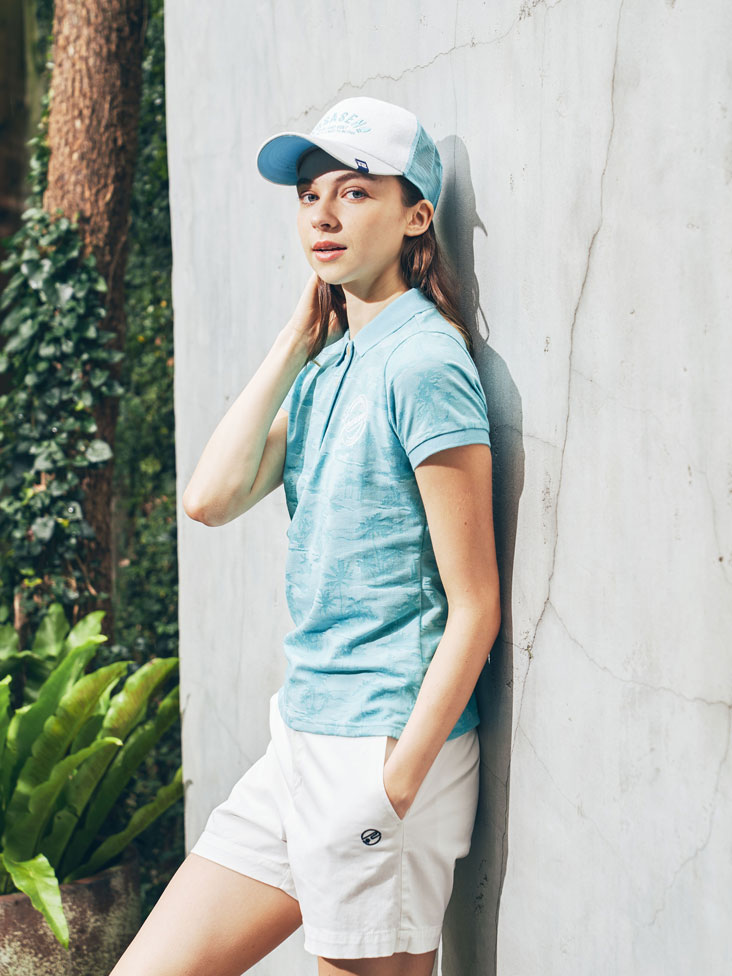爽やかなエメラルドグリーンのポロシャツに白のショーツを合わせたコーディネイト。ポロシャツにさりげなく入ったアロハ柄も上品で大人っぽさもプラスしたスタイリング。