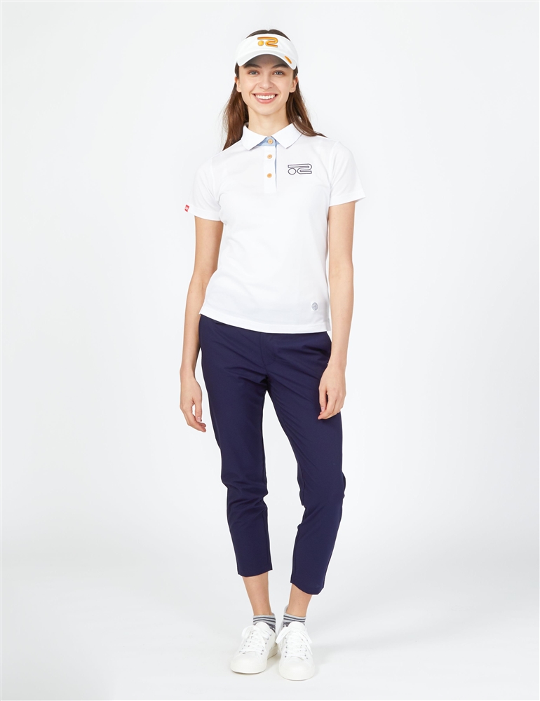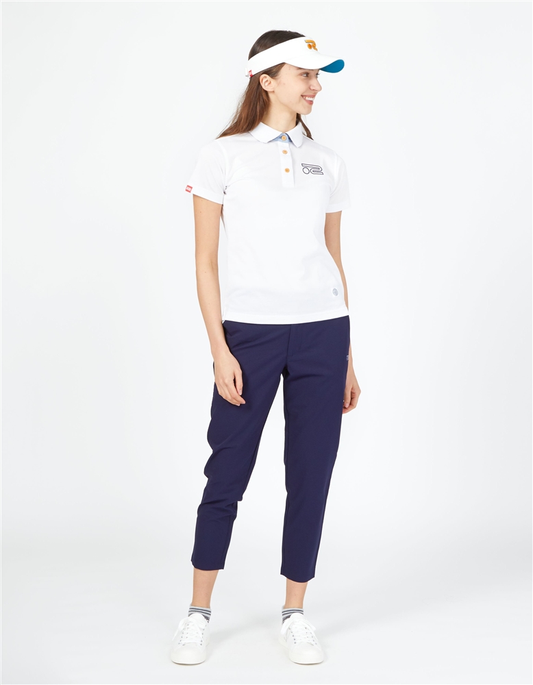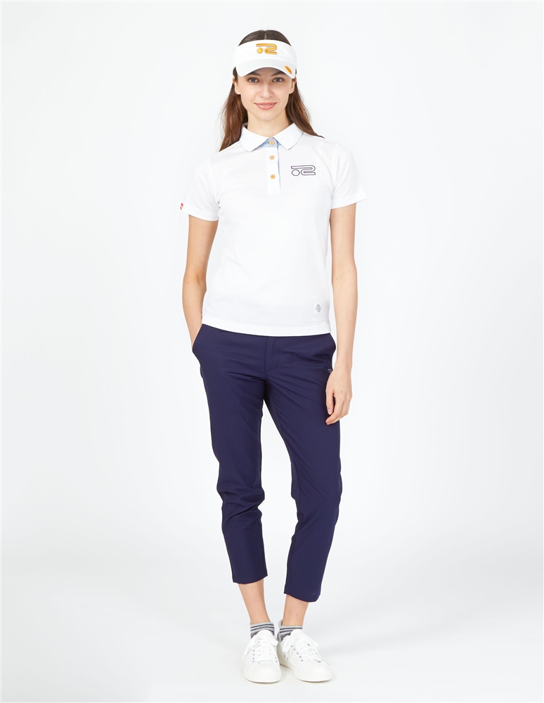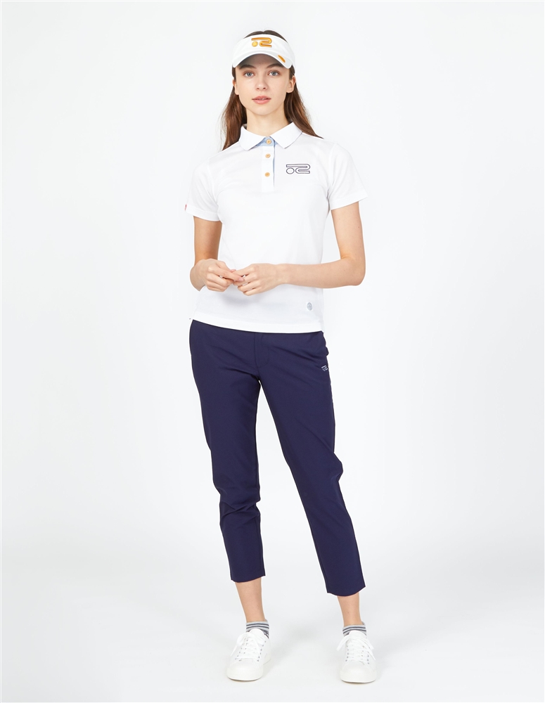 爽やかなホワイトポロに通気性に優れたパンツを合わせたコーデ。パンツをクロップド丈にすることで、足元がすっきりとし、見た目にも涼しい夏のスポーティスタイルに。