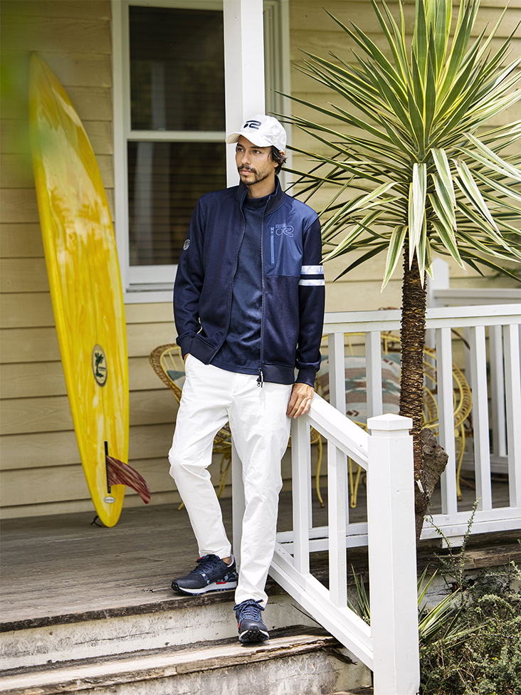 ラインやワッペンにカモフラ柄をデザインが特徴のブルゾンと白のパンツを合わせる事によりはっきりしたコントラストをつけたスタイリング。通気性抜群のブルゾンやパネルジャカードで部分的にメッシュ組織にしたインナーは残暑の秋にも快適。ロサーセンらしいネイビーを基調としたベーシックなカラーでまとめ、大人っぽく秋の立ち上がりのプレイスタイルにベスト。