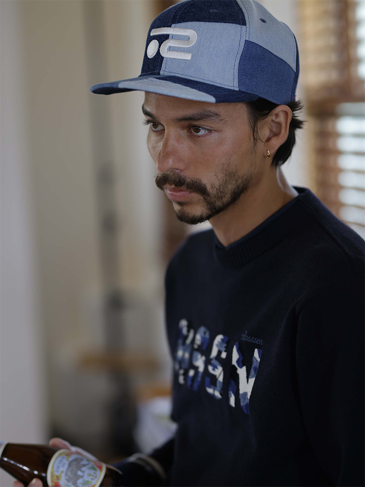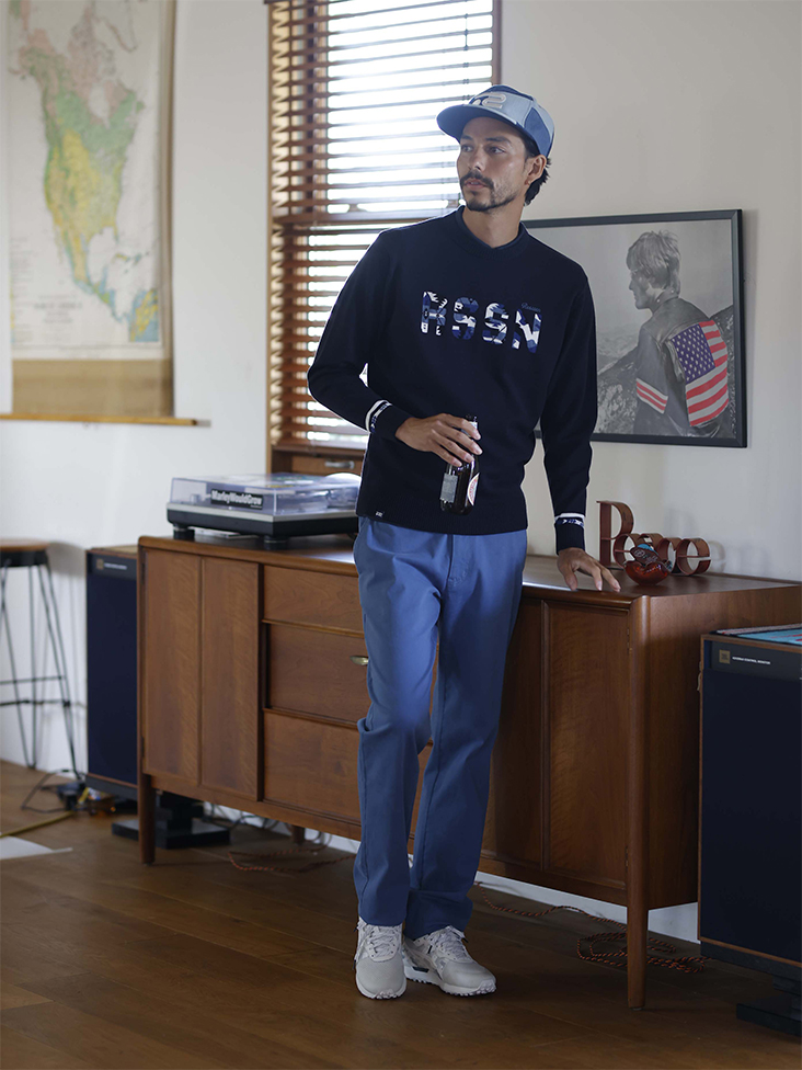 フラとカモオルテガ柄が組み合わさったロゴ使いが特徴的なニットをメインにスタイリング。カジュアルなデザインながら蓄熱、抗菌、防臭などを備えた高機能アイテム。デニムパッチワークのフラットキャップを合わせた、ゴルフはもちろん普段使いにも最適なコーディネイト