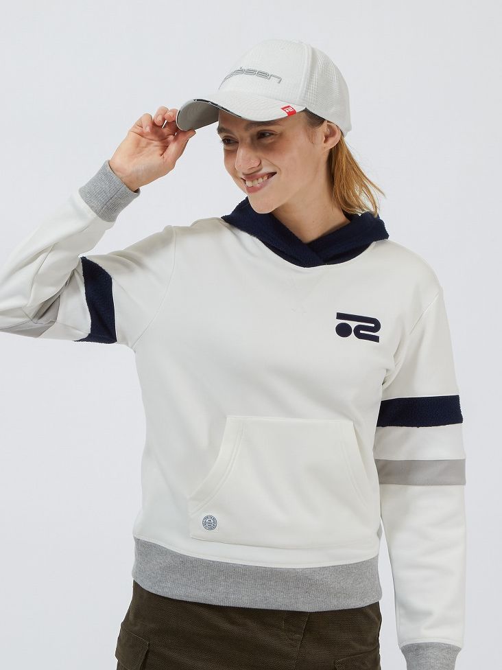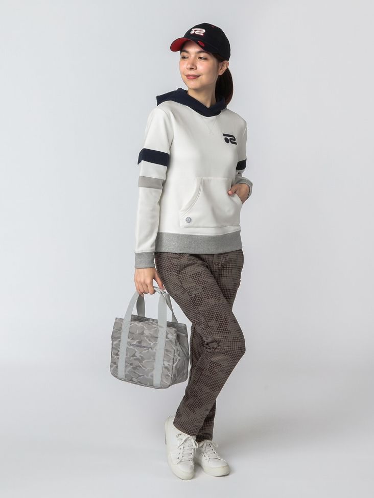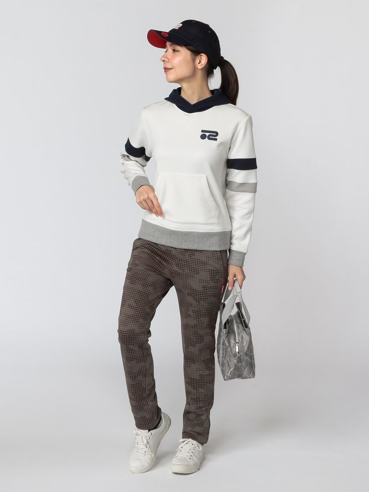 レトロな配色切り替えが特徴のプルオーバーパーカーにロングパンツを合わせたカジュアルスタイル。パーカーは保温性に優れ、軽量なので一枚でも真冬のインナーとしても活躍できる便利なアイテム。パンツは格子状に入ったカモフラージュが特徴的な、軽量で保温性に優れた高機能アイテム。