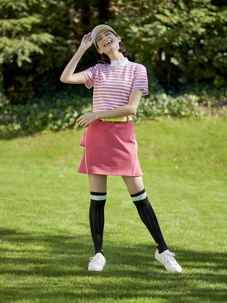 肌さわりの良いワッフル素材の鮮やかな色のボーダーモックネックとスカートは軽くて伸縮性のある素材のを使ったラインパイピングと裾部分は切り替えのソフトフレアなスポーティーなスカートのスタイリングです。小物をネオンイエローやブラックを使うことで甘すぎないクリーンでさわやかでありながら女性らしい印象のスタイリングです 初心者の方はもちろん上級者の方も満足いただける商品を使ったスタイリングです。