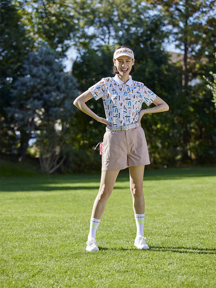 色鮮やかで丸みを帯びたフォントがポップな印象のポロが目を引くスタイリングです。あえてボトムは少し裾が広く台形シルエットのキュロットタイプのチノっぽい見え方の綿ライクな撥水ポリエステルを使用のショーツでカジュアルなイメージに見せ 上半身はより華奢に見えスタイルが良く見えるAラインのバランスなスタイリングにしています。