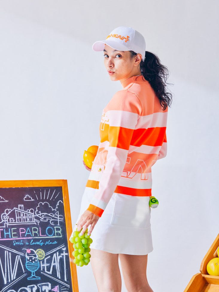 ジューシーなフルーツの様なカラーのニットを見せるスタイリング。オレンジをキャップのロゴで統一してまとまりのある色使いにしています。ボトムはホワイトで軽く春らしく。