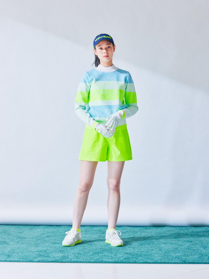ジューシーなフルーツの様なボーダーカラーニットと、ショーツで色を合わせた鮮やかなスタリングです。
