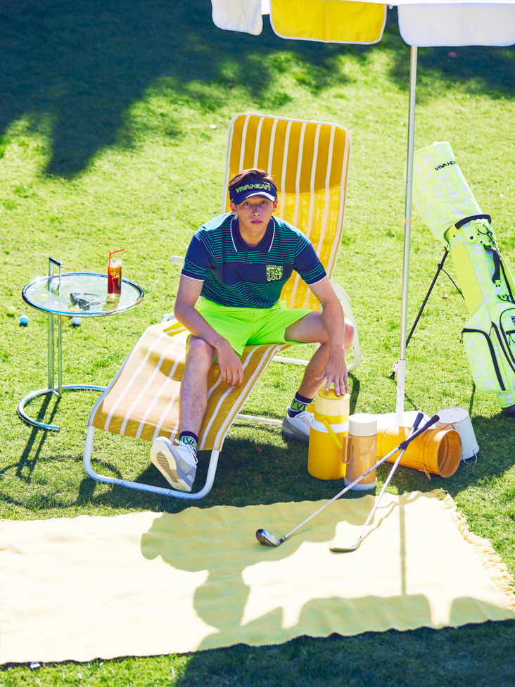 クリーンなグリーンボーダーのポロシャツは胸と袖部分でカラーブロッキングにすることでよりスポーティーなアイテムに。ショーツも若干ワイドなシルエットでラフ感を演出しています。全身のカラーはグリーンを軸にし、ネイビー・ネオンイエローの3色で組み合わせることでまとまりを持たせているのがこのスタイリングのポイントです。