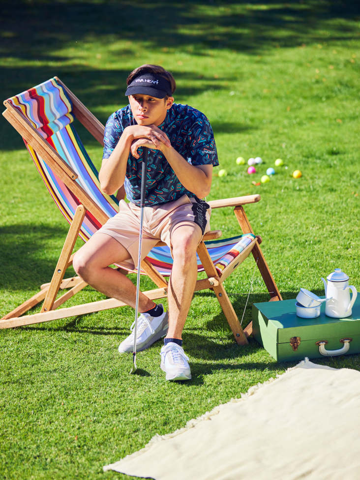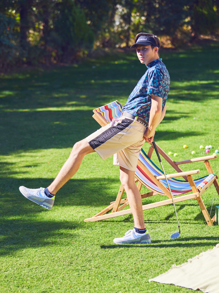 重なりあった色とラインで作られたランダムグラフィックで表現されたモックネックシャツは、動きに合わせメッシュ構造が風を身体に取り入れます。汗をかきやすいこの時期のラウンドには最適な素材。ジャージーショーツは中肉で肌触りの良いダンボール素材を使用し、身体の動きを妨げないコンフォータブルな着心地です。コーデのポイントは、バイザー・トップス・ボトムスにブラックカラーを入れる事で全体がしまりシャープな印象に。