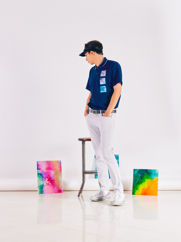 スクエアに区切られた3段のアートモチーフのポロは、キレイめなカノコ素材を使用したレギュラーフィットを採用。グラフィックにインパクトがあるので、ボトムスはシンプルなスリムタイプのチノで合わせると相性抜群のアイテムです。