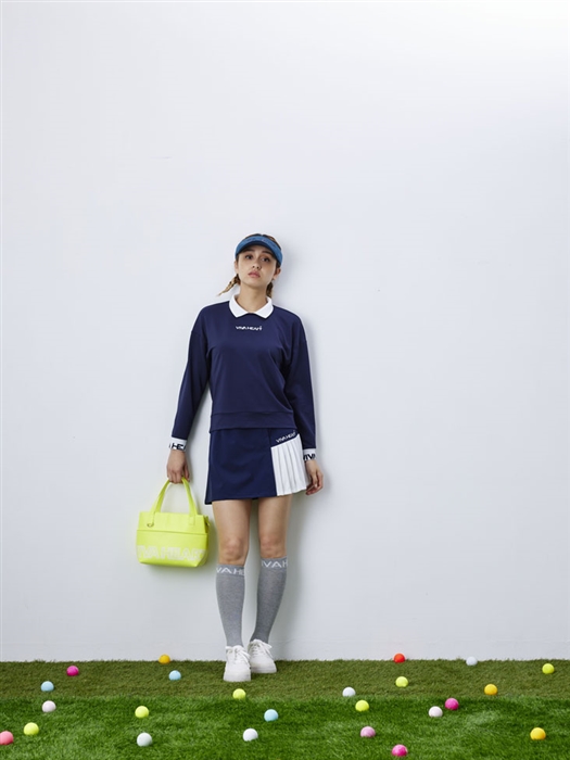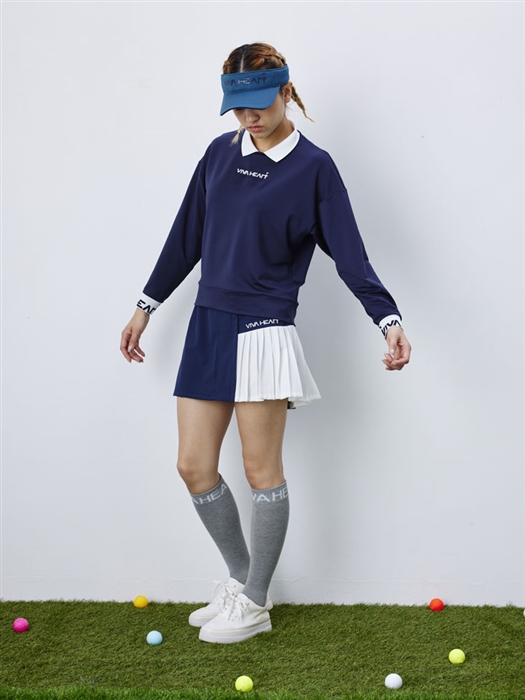 ストレッチ性に優れたジャジー素材の配色ホワイトの衿がポイントのトップスに、同じくネイビーカラーで配色ホワイトプリーツのデザインスカートを合わせた、カジュアルな見え感だけど女性らしく見えるセットアップ風のスタイリングに仕上げています。