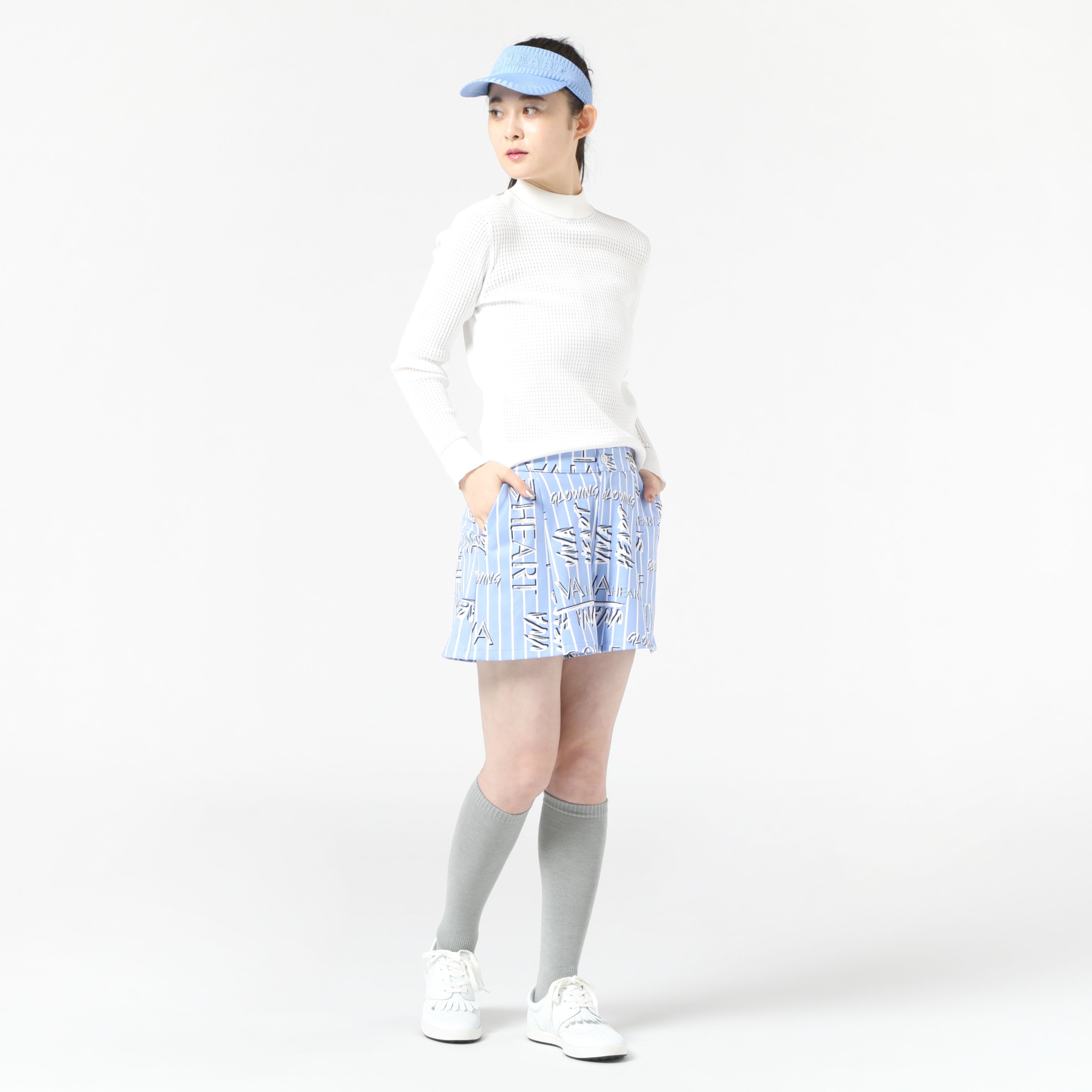 フレッシュブルーのストライプをベースに遊びのあるグラフィティータイポのボトムのスタイリングです。ワッフル見えするアイレットがポイントの軽い編地のニットは清涼感が