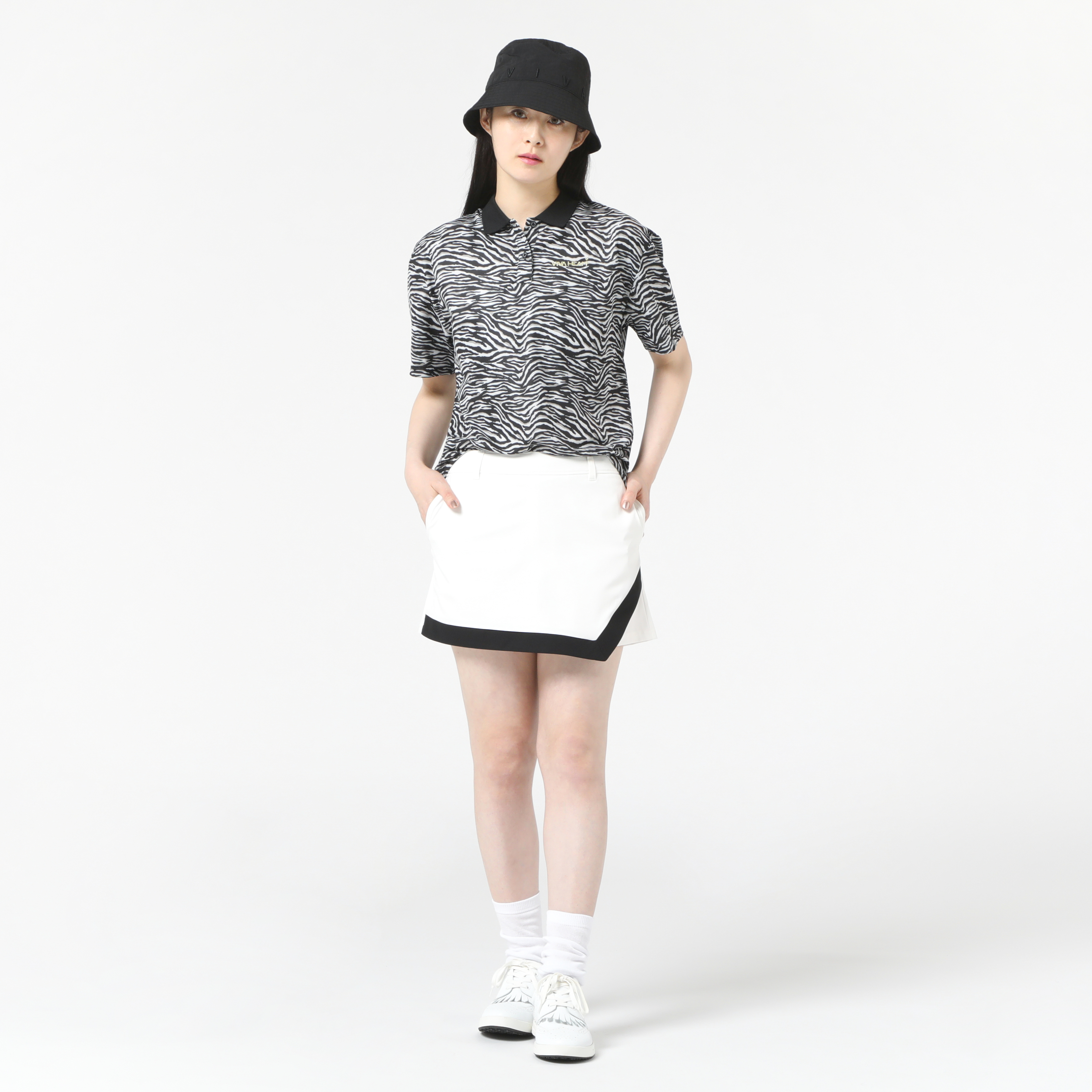 ゼブラ柄のトップスのシャツは少しワイドシルエットでラフに着用できるサイズ感です。少し遊び心の有るトップスと相性の良いボトムはトリミングの効いた大人っぽいスッキリしたシルエットのスカート見えのショートパンツと合わせたラフ感ある大人スタリングです。