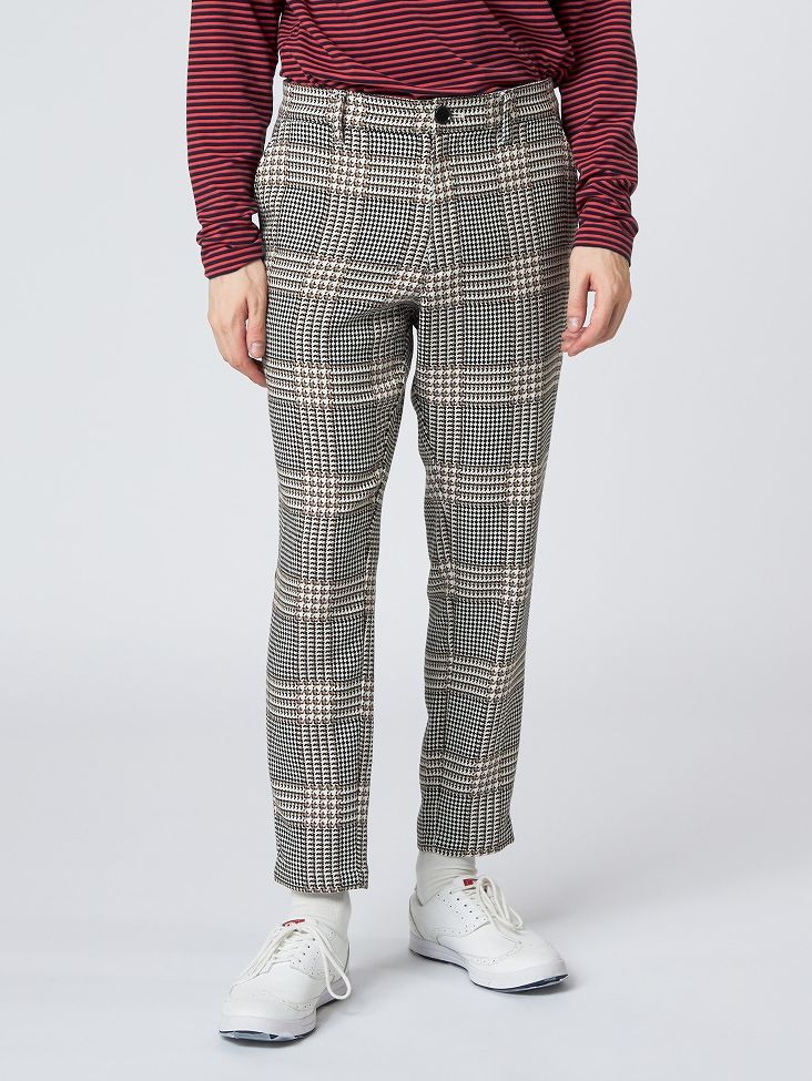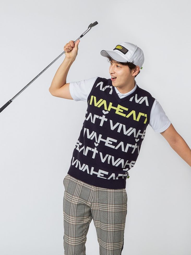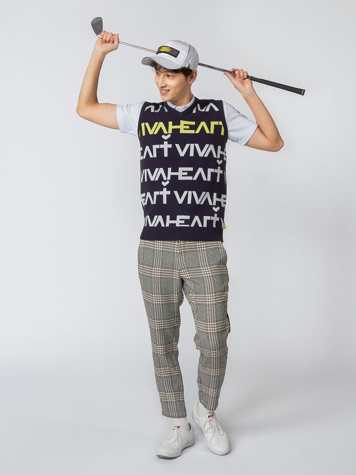 大胆な総柄ジャガードロゴをがインパクト大のベストアイテム。オーセンティックなサイドラインのチェックパンツとロゴアイテムの相反するMIXスタイリングが新鮮。グリーン上でもオリジナリティとアイキャッチになる事間違いなしの「LOGOMANIA」になれる差別化スタイリングです。