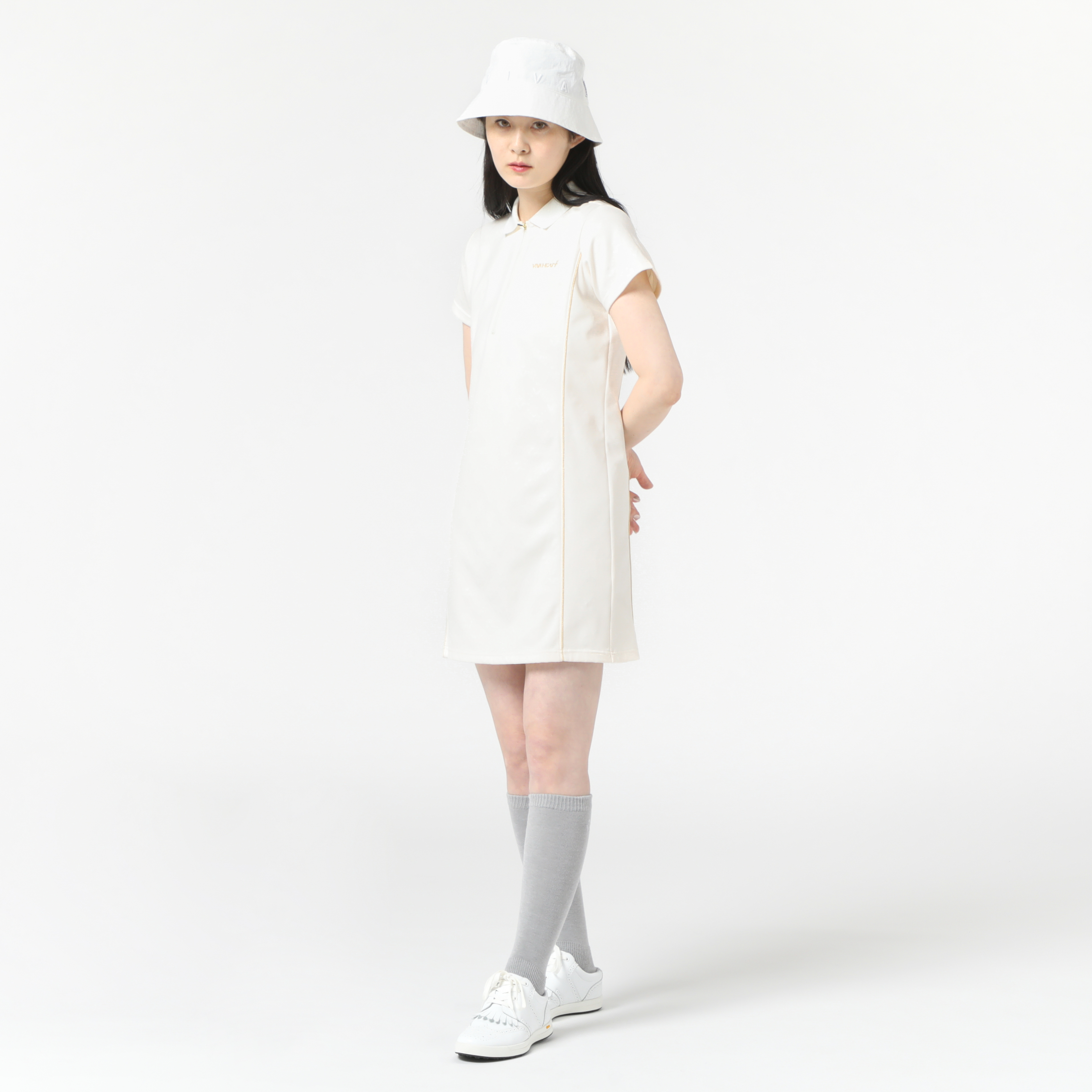 ~ホワイトカラーのワントーンスタイリング~スッキリしたシルエットの無地見えなモノグラム風のブランドロゴエンボスプリントでを施したジャージー素材のワンピースのスタイリングです。ワンピーススタイリングはフェミンになりすぎるので、帽子をバケットハットで少しボーイッシュなアイテムを合わせこなれたワンピーススタイリングです。