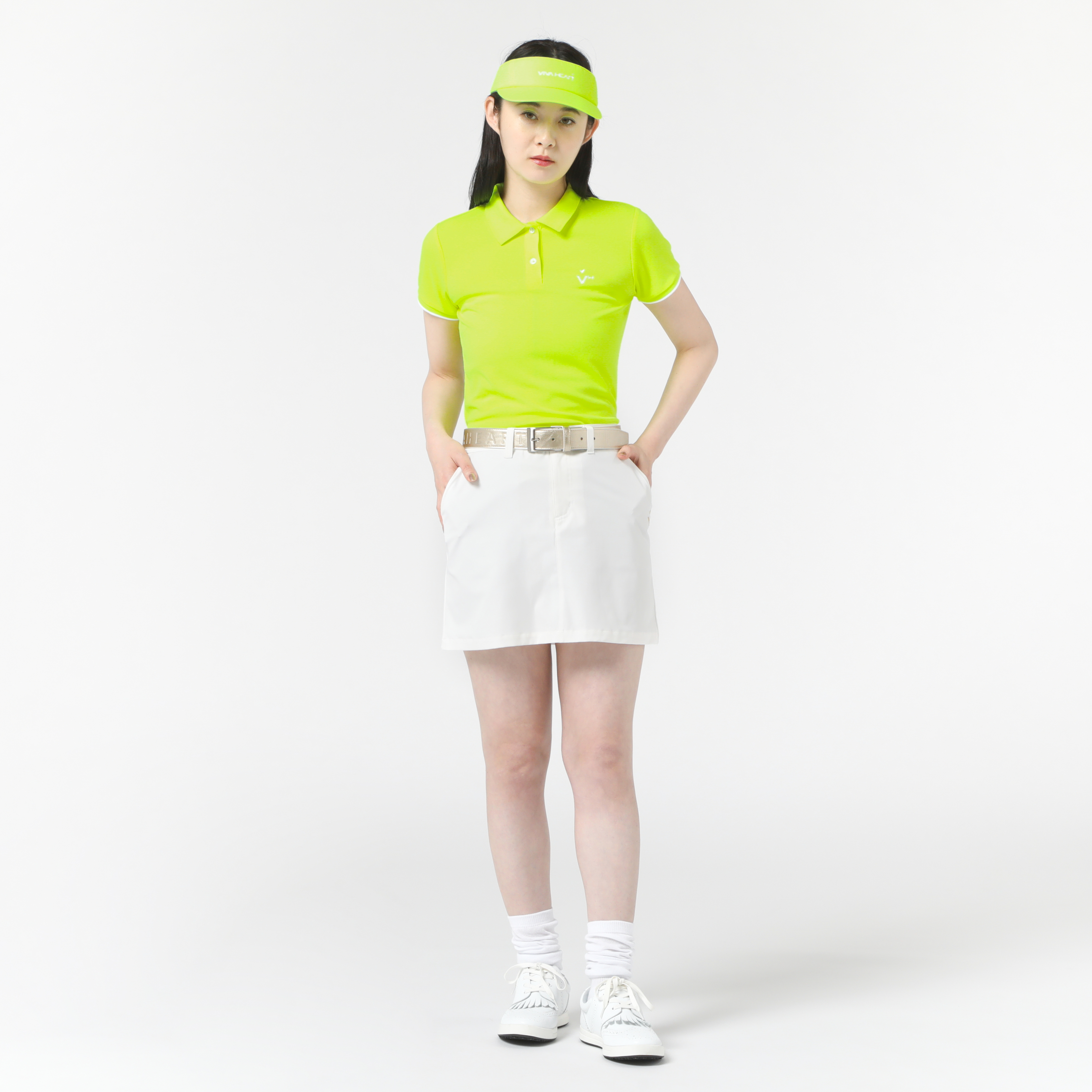 衿裏にブランドのロゴを入れた襟を立てても可愛いポロシャツと、綿ライクな質感のナチュラルな風合いを持つ定番スカート。バイザーと色を合わせ夏らしいネオンイエローのスタイリングに。