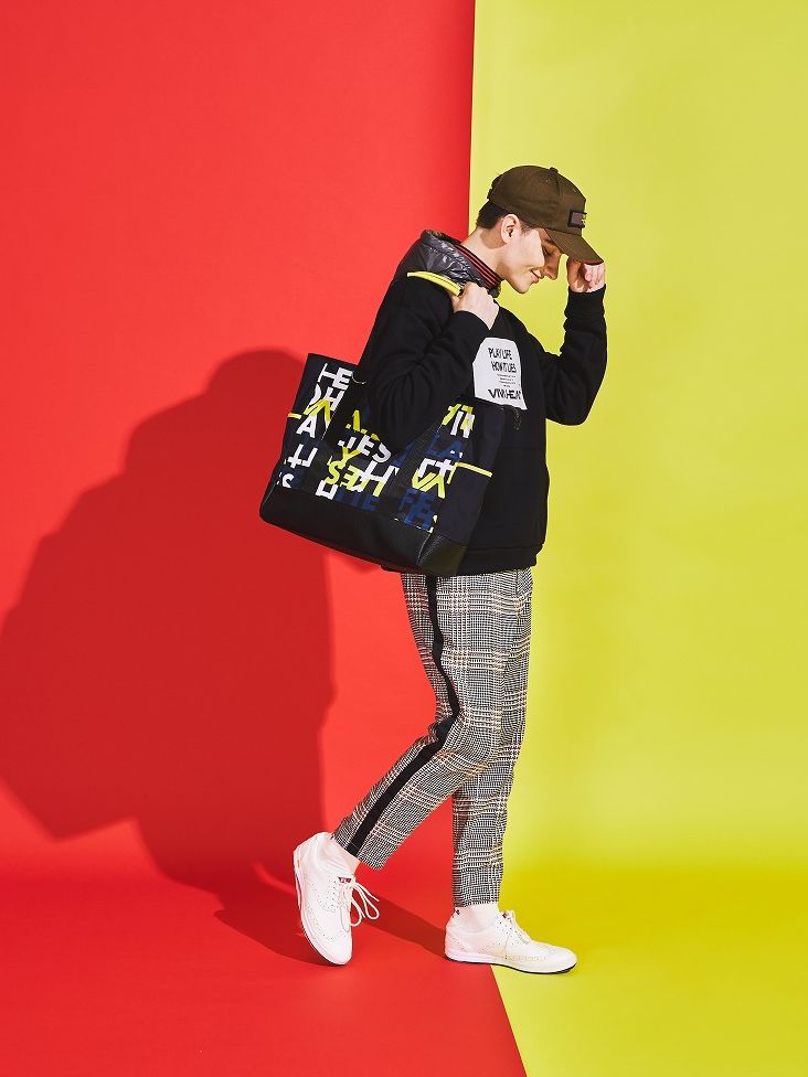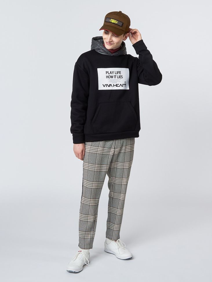 PLAY LIFE HOW ITLIES(あるがままに人生をプレイしよう!)今季のメッセージが込められたタイポグラフィーの裏起毛フーディーとオーセンティックなサイドラインチェックパンツ。
