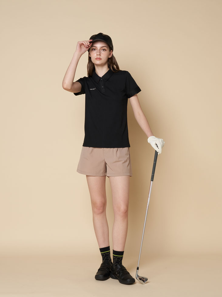 衿裏に小さなハートドットの配色が隠れた、柔らかな鹿の子の半袖ポロシャツにタフタ素材の軽やかなショートパンツを合わせたスタイル。小物はブラックとネオンイエローで効かせ、女性らしいけど格好良いスタイルを確立。衿を立てて柄を見せても◎