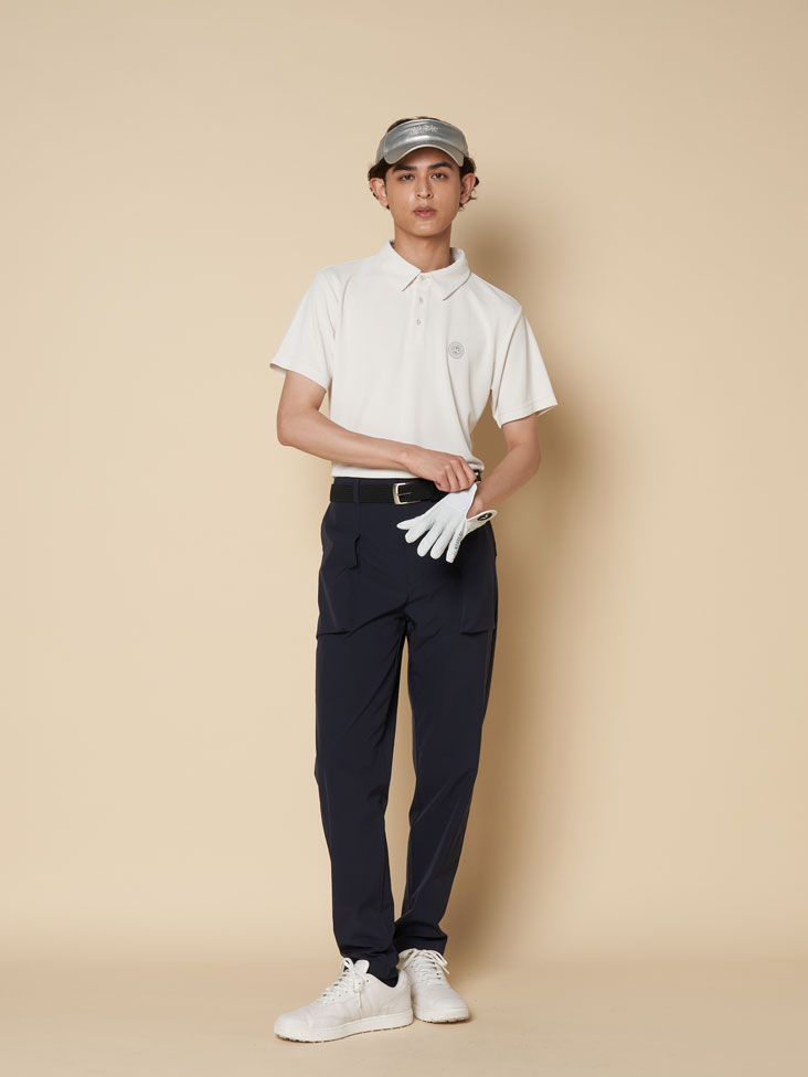 VIVA HEARTのキャラクター「ハートアイ」のラメプリントを胸元にあしらったモードキッチュなポロシャツと、アウトドアライクなアウトポケットパンツのコーデ、暑さの残る初秋にぴったりの大人なスタイリング。