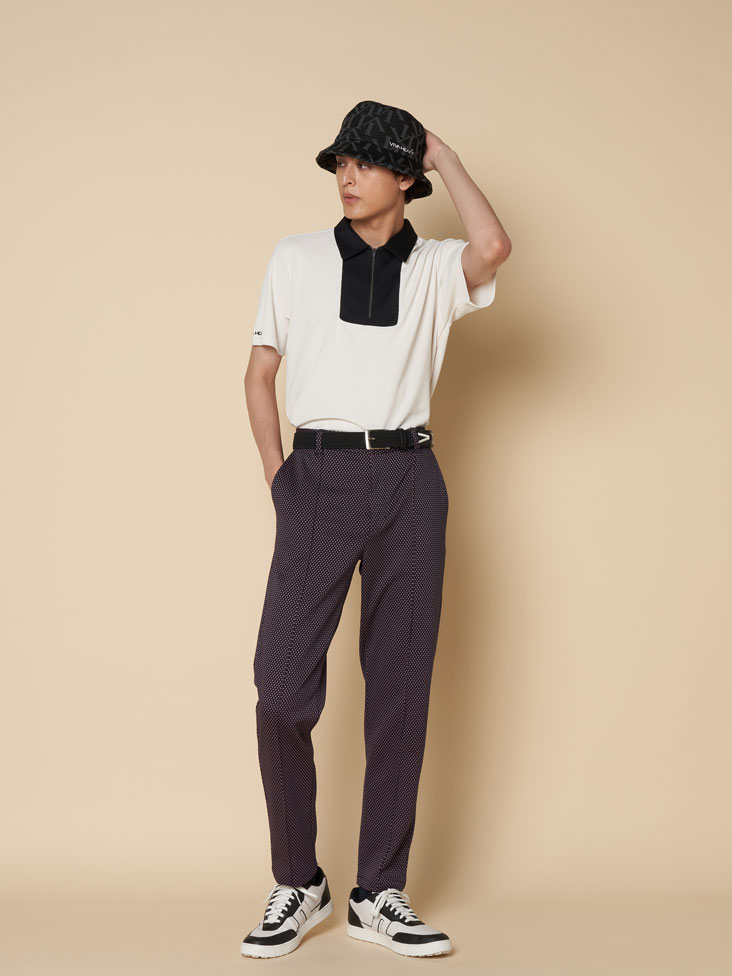 バイカラーのピンタックのデザインポロシャツとダイヤゴナル柄のパンツのコーデ。トップス、パンツ共に抜群の肌ざわりとストレッチ感がありクラシカルな見た目とは裏腹に活動的なウエアです。