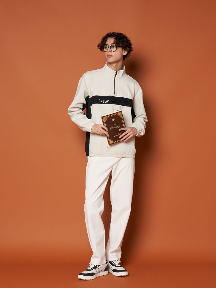 ハーフジップのプルオーバーは脇をシームレスにスイング動作をしても形が崩れないゴルファーに嬉しい設計のアクティブジャージーです。ライトベージュ×ブラックのスポーティーな配色。パンツはリラックスフィットのストレートパンツでスッキリと見せています。
