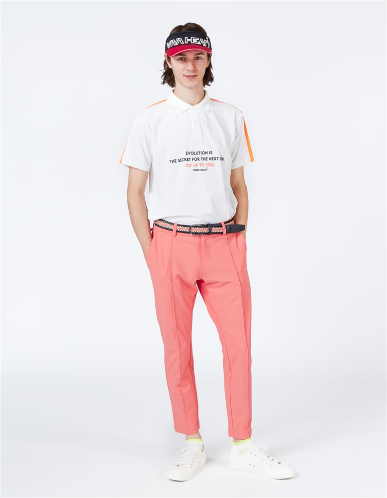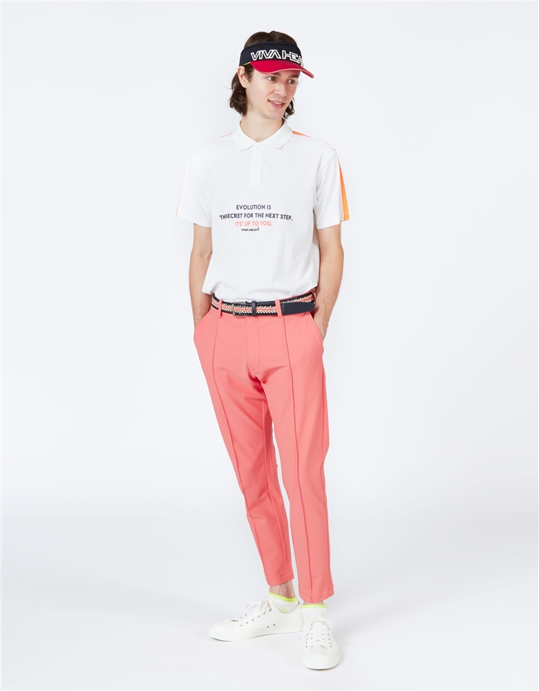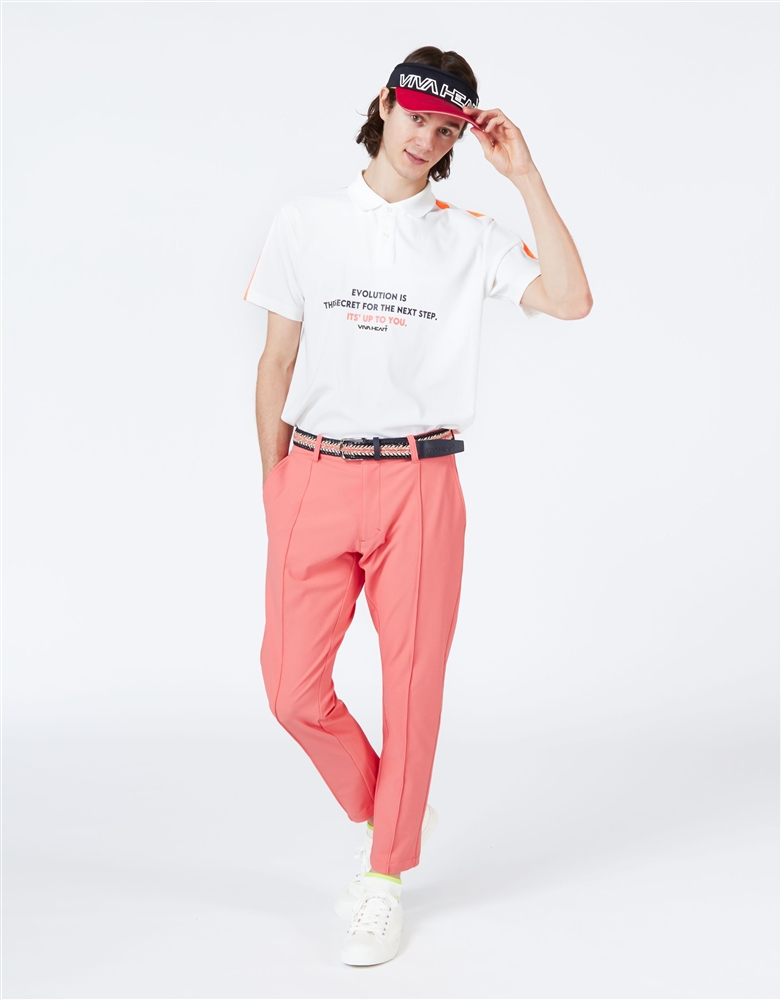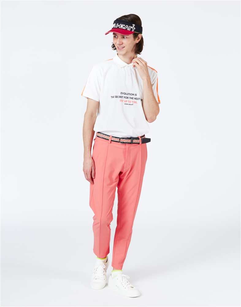 ウェア契約をしているプロ選手がリスペクトしている言葉をタイポグラフィで表現したポロは、身体の動きが10%加わるだけで通気性がUPするベアメッシュ生地を使用。ボトムスはスッキリ見えのクロップドテーパードで足元も軽快にスタイリングしています。初夏の日差しを浴びて思いっきりゴルフを楽しんで下さい!