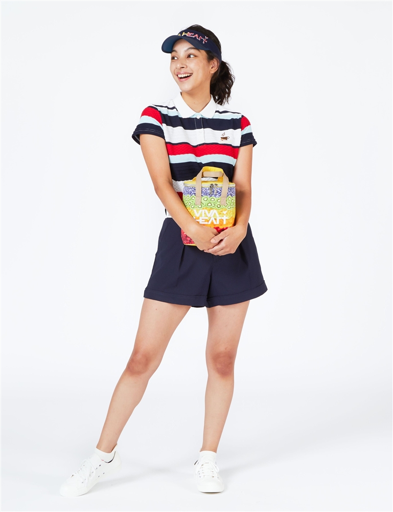 ハチノス編み、リップル編み、天竺編みを配色で大きめに区切った新しい見せ方のボーダーのポロに、裾をダブルにしたキュロット風でガーリーな印象のショートパンツのスタイリング。ボーダーポロは吸水速乾機能付で着心地も存在感も抜群。ショートパンツは夏場の暑い時期に重宝するシアサッカー素材。クールマックスの糸を使用しているのでサラリとした肌ざわりと吸水速乾性、ナチュラルストレッチを持ち合わせます。見た目にも、ラウンド中も軽やかで動きやすいスタイリングです。