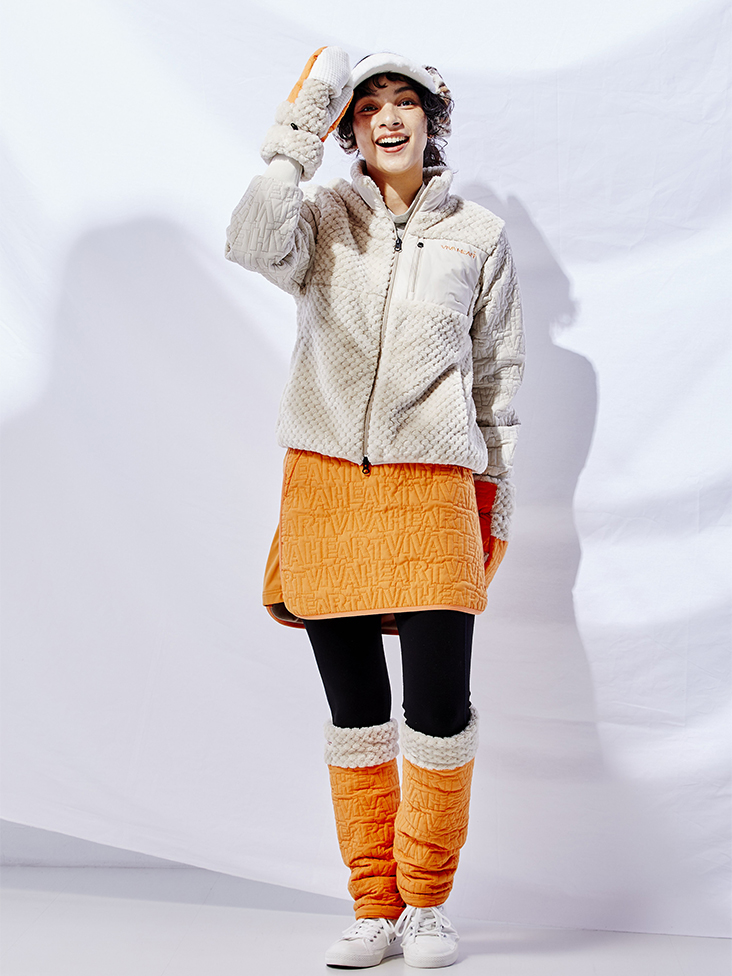 そのブルゾンに同じロゴタイポグラフィのキルティングスカートを合わせることで統一感のあるコーディネートに。寒い時期でも周りと差をつけたゴルフファッションを楽しめるスタイリングに仕上がってます。