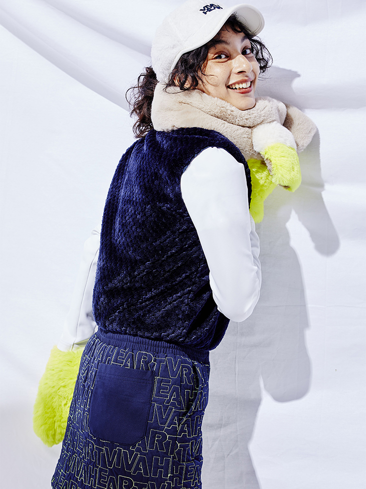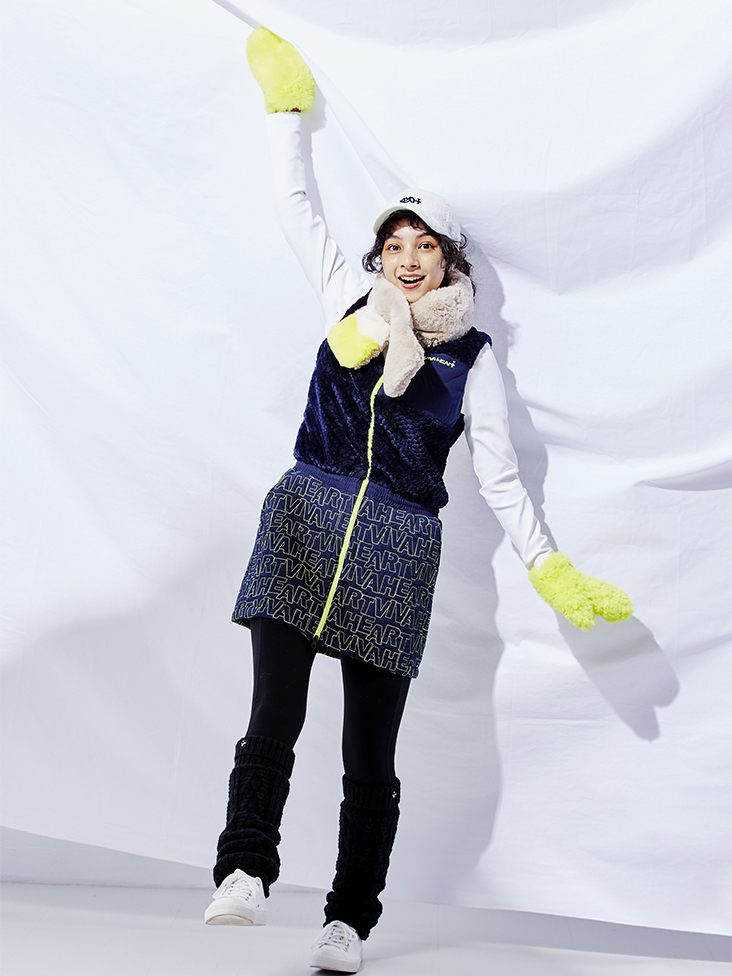 ふわふわが目を引く可愛いワンピースはスカート部分のキルトがロゴタイポグラフィーになっており、ファッション性を兼ね揃えたデザイン。ストレッチのある中綿キルティングなのでゴルフに最適な機能も備わっており、冬のゴルフに大活躍するスタイリングになっています。FLUFFYな小物が可愛さを演出してくれるだけでなく、首周りに置くことで小顔効果も期待できそう。