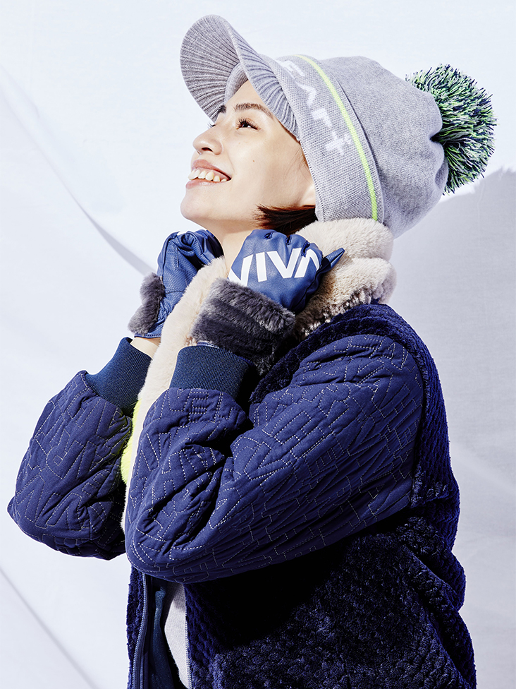 袖部分のキルトがロゴのタイポグラフィになっているボアブルゾンを同じ柄のキルティングスカートと合わせた冬のゴルフでも暖かく快適に過ごせるスタイリング。
